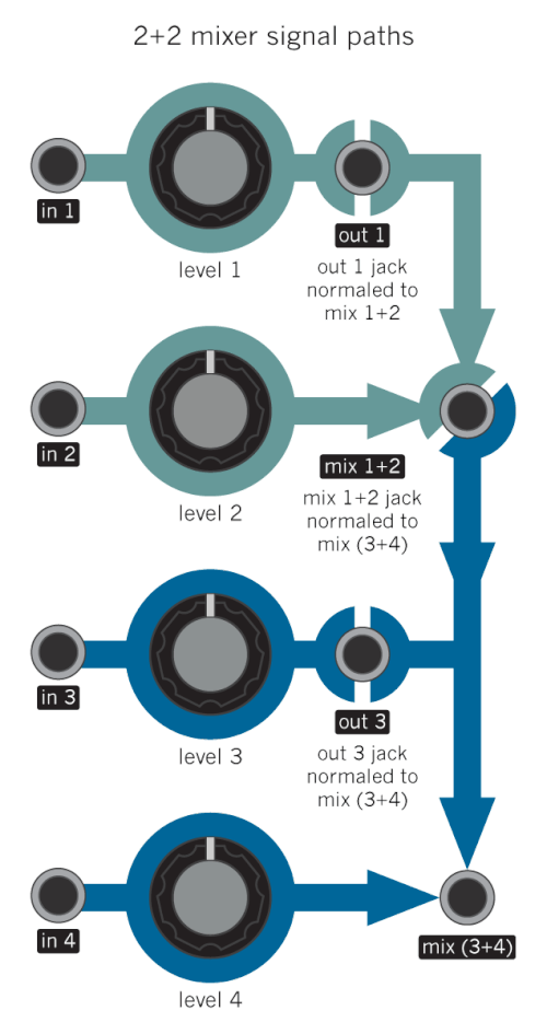the channel controls utilize a logarithmic volume curve tuned for audio signals but the module will work with cv as well. the diagram below illustrates the signal path of the 2+2 mixer. patching the output