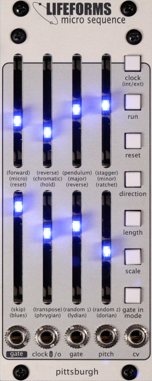 with a simple, performance focused interface, the feature set of the lifeforms micro sequence module speaks for itself. eight sliders with integrated channel mute. eight quantized scales. eight sequencer