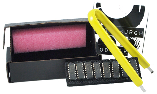swapping out chips a breeze, a sticker, a fancy cardboard box with anti-static foam to keep everything safe, and a secret prize. the logic chips included in the mod pack are nor, nand, xor, xnor.