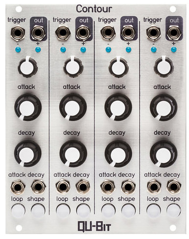 contour is a quad envelope generator. each channel has looping, cv over attack and decay, as well as unique chaining capabilities. this makes for the creation of complex modulation patterns with a minimum