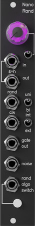 audio rate square waves, and a combination of all algorithms, nano rand creates a signal that would otherwise take a multitude of modules to produce. on top of the fluctuating random voltage output, it is also capable of producing the most musical random gate