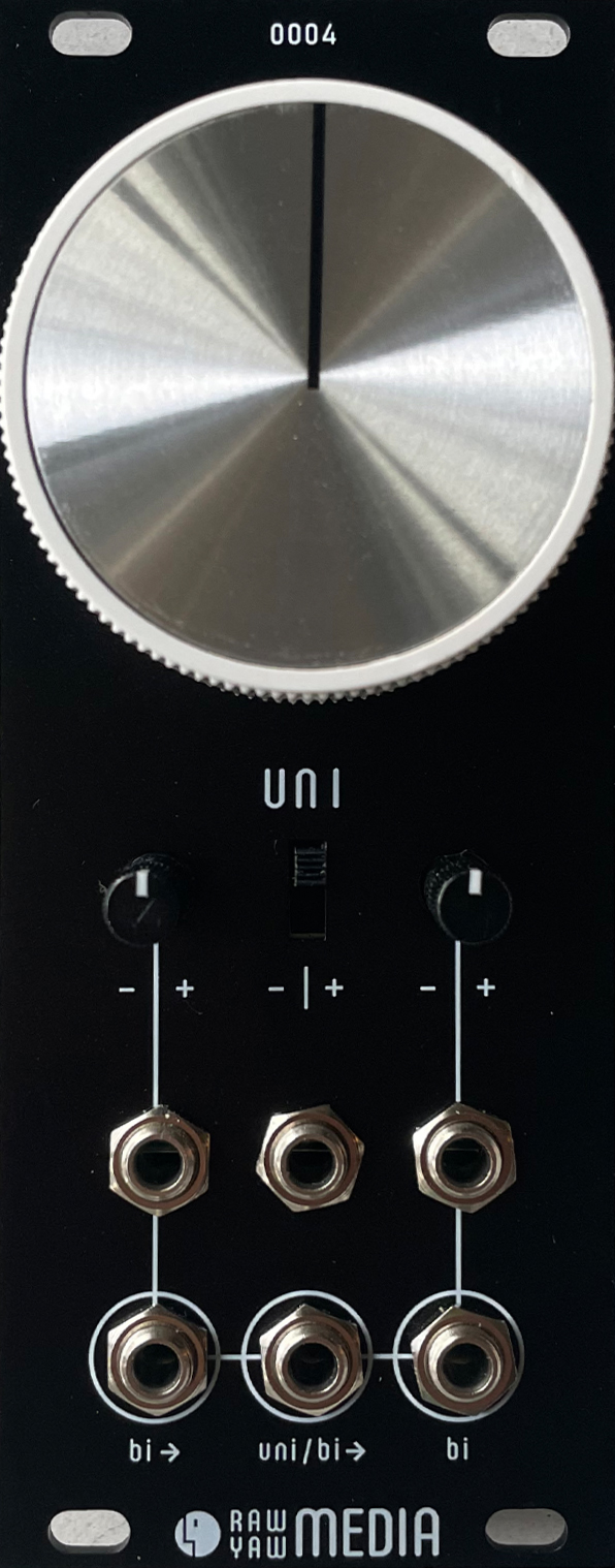 | raw yaw media uni: big knob price : $89.00 | | the uni is a triple attenuverter utility module designed to give cases gigantic macro control knobs.