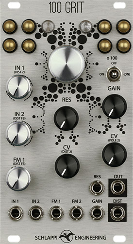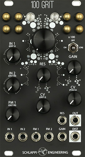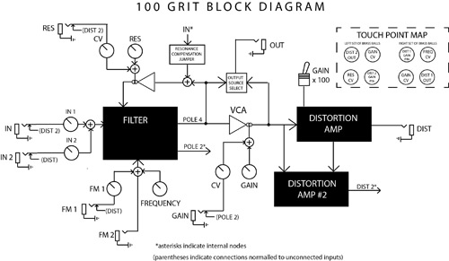 the 100 grit consists of a low pass filter, vca and distortion section with 8 touch points, voltage control over drive, resonance, and frequency, along with a plethora of feedback paths allowing it to operate