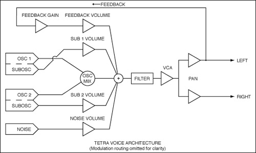 the voice architecture is based on the prophet '08, but with the addition of a sub-octave generator for each oscillator and a fully programmable feedback loop for each voice.