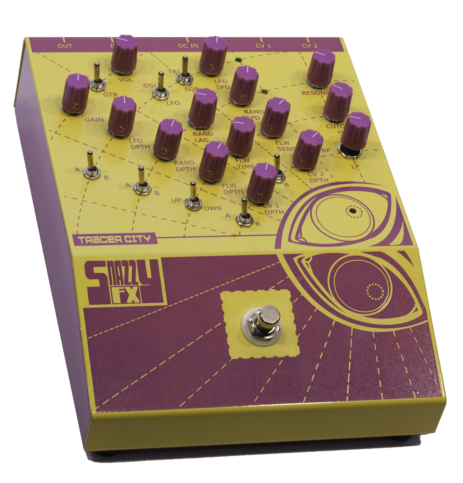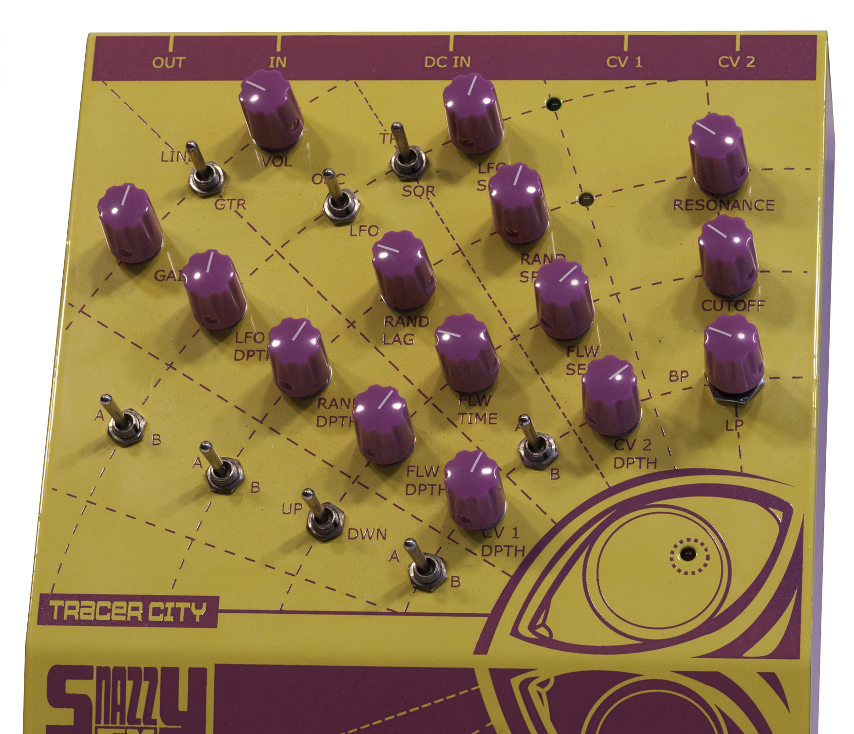 tracer city has the ability to handle line or guitar levels and enough gain to drive the signal into smooth overdrive. with control of cutoff, resonance, linear or exponential modulation, this is a box you can