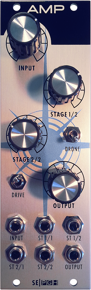 the amplifier (amp) is a 2 stage class a discrete design using 3 pairs of hand matched transistors. envelope is usually applied to st1/1. st1/2 goes thru an attenuverter and can be used for envelope or