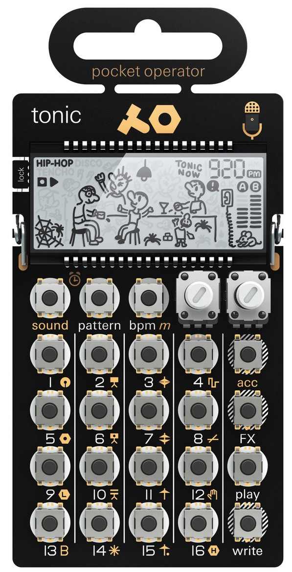 po-32 has a built-in microphone for transferring and receiving data over sound. it also has a removable lock tab for write protection of patterns. the hanger strength is increased for extra durability, and on