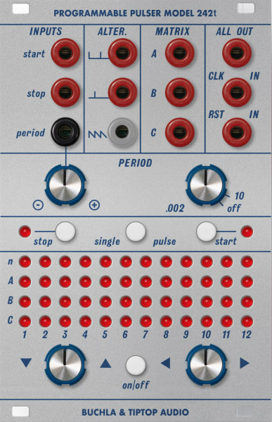 the programmable pulser model 242t from tiptop is a eurorack version of the classic pin-matrix equipped gate generator. update for eurorack, the pin-matrix has been replaced with a 4x12 matrix of leds which you can scroll through using the two knobs below. this will let you address each channel individually to tell it to fire off a