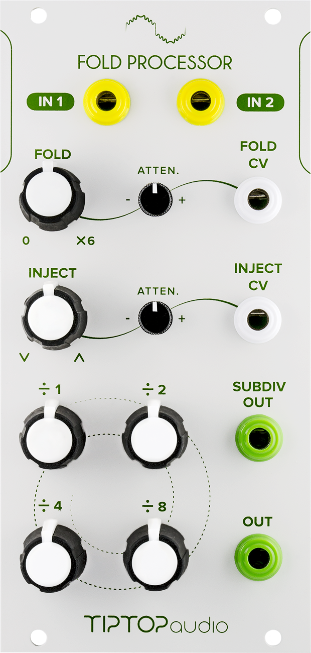 the fold processor is a voltage controlled wave multiplier and sub-octave generator. the circuit is based on a classic diode design that adds odd harmonics by folding the incoming signal, followed by