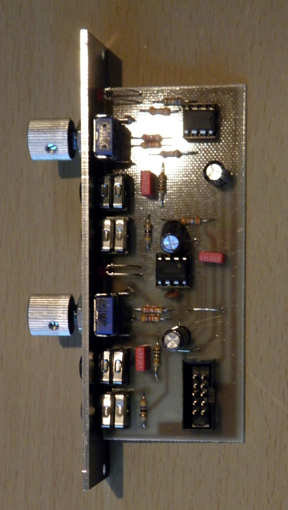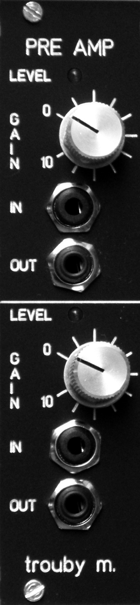 the pre amp is a dual preamp with gain from 2-50 (6-46 db), signal and level leds. it is 6 hp wide.