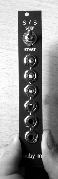 the trouby start / stop module accepts a voltage clock source and acts as a gate to turn it on and off. useful for manually starting and stopping sequencers, clock dividers and the like.