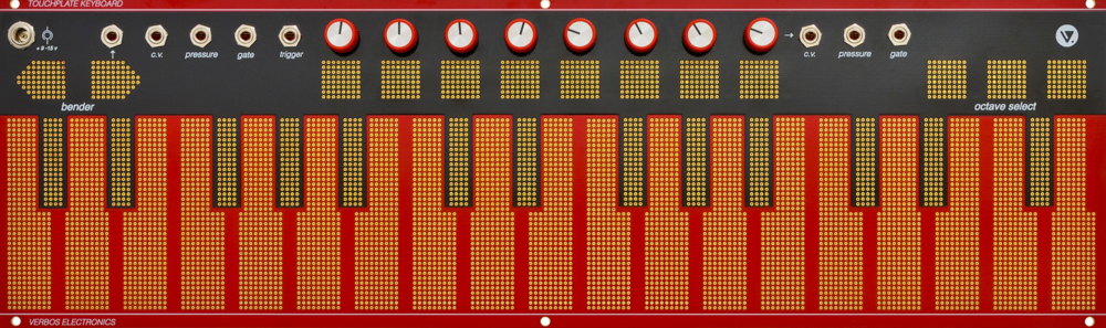 in the great tradition of west coast synthesis, the verbos electronics touchplate keyboard is a gold plated controller with 3 independent sections for sending control voltage signals. first is a 32 key volt/oct