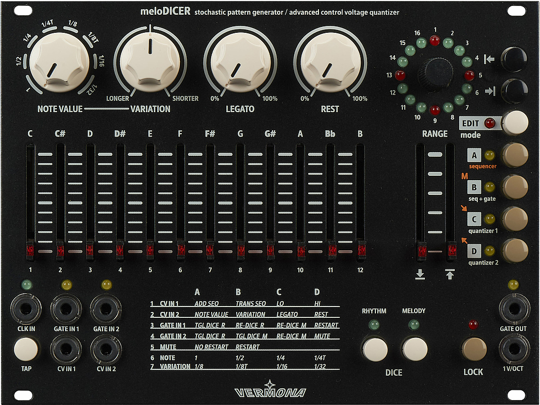 rhythm and melody in any wanted direction. it doesn't matter if you are a music theory genius or if you never heard of triplets, ties, and the like. just take a look at the module's surface and start playing with