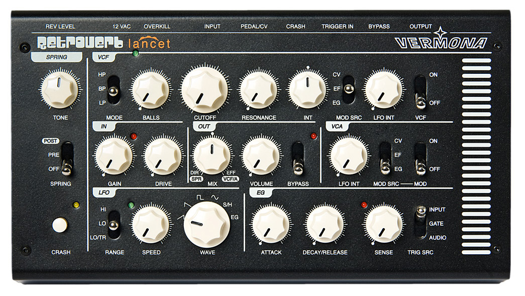 analogue multi-effects-processor. it offers overdrive, filtering, vca, envelope and lfo to manipulate the spring sound and create different sounds like auto-wah, tremolo, distortion, delay, gater and of