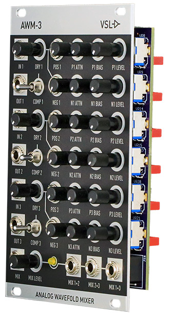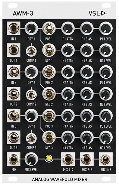 the awm-3 is an all analog, real-time, complex wave-shaping (triple wave-folder) 3-channel mixer module with added features of compression and multiple mix modes including matrix mixes. the combination of