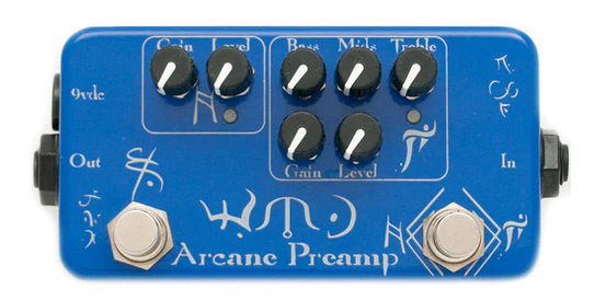 the new wmd arcane preamp is a two channel true bypass pedal. the first channel is a medium gain boost that adds a little bit of sparkle and breaks up into a soft overdrive when hit hard. the right footswitch