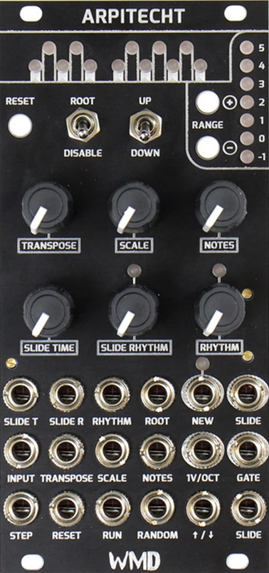 the arpitecht features 16 scales, each with a unique set of "note masks" offering hundreds of note combinations with the ability to dial in via knobs on the front panel or cv. 32 rhythm patterns and 32 slide