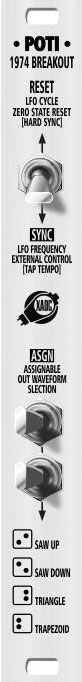 the poti is a 3 hp expansion module for the batumi. it allows easy access to the reset function and waveform selectors. the breakout is 3 hp and its a passive module, meaning it does not consume any power.