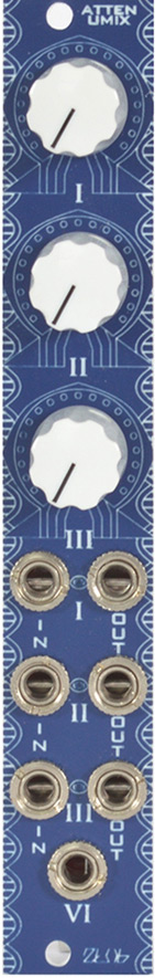 the zlob modular attenumixer is a three channel passive attenuator with a sum. each channel is normalled to the sum(vi) so it can be used as a 2 channel mixer and 1 channel attenuator, or a 3 channel mixer, or