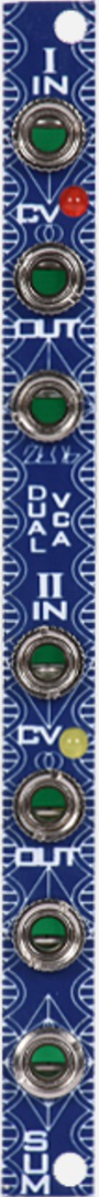 the dual vca is a 2 channel dc coupled ota linear vca based on the same fabled design of the vnicursal vca. the 2 vcas are summed together so it can be used as a voltage controlled mixer or all 3 outs can be